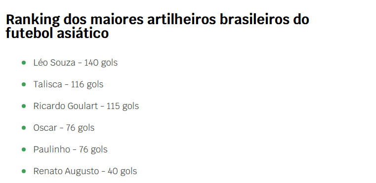 近日,巴西著名体育媒体《兰斯体育》,发布了一份巴西球员在亚洲进球数的排行榜。上海海港前锋莱昂纳多以140个进球高居榜首,排名2~6位的分别是塔利斯卡、高拉特、保利尼奥、奥斯卡和奥古斯托。
