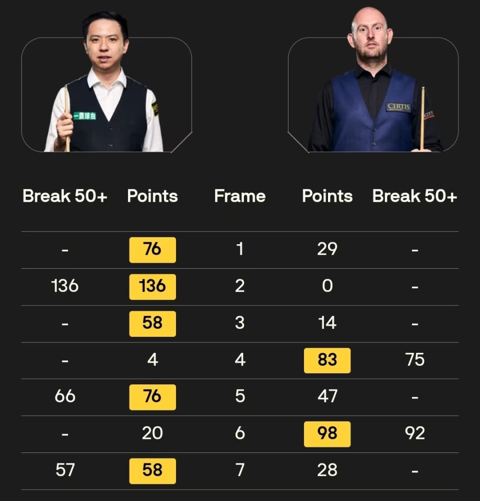 第四局,塞尔特率先拿到1分后因犯规被罚4分,随后肖国栋薄球失误不幸将黑球打进被罚7分。塞尔特抓住机会打进红球获得上手机会,并凭借单杆打出75分的表现以83:4拿下此局从而1-3落后肖国栋缩小分差。